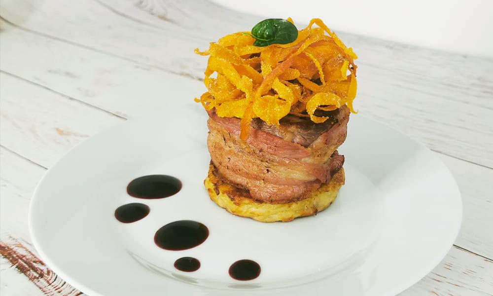 Pronti per un secondo piatto bomba? E' il filetto croccante di Rosy: filetto di manzo con guanciale, patate e chips di carote.