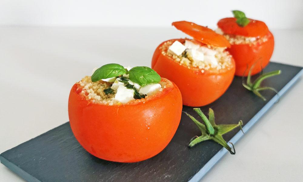 Pomodori con doppia cottura al forno, sia statico che grill, ripieni di un cous cous fresco condito con basilico, mozzarella e feta.