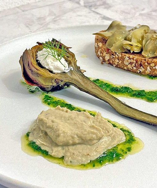Sott'olio preparato in casa, un carciofo a doppia cottura e un patè di carciofi da spalmare in un crostino o da mangiare a cucchiaio. Il tutto accompagnato da un filo d'olio al pr