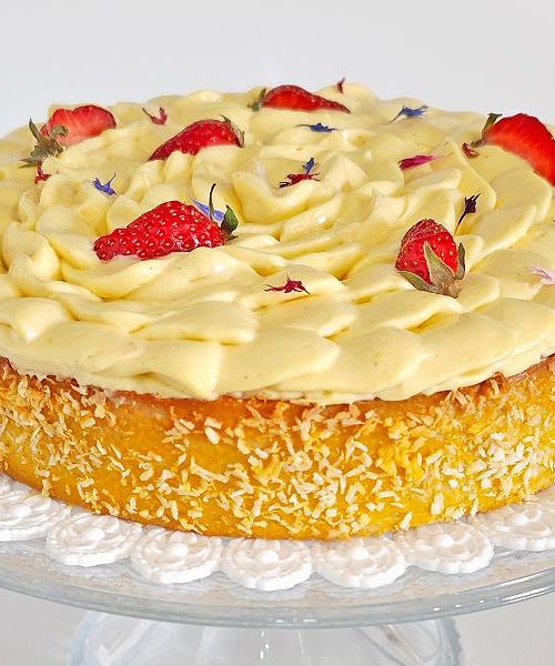 Crostata dalle consistenze particolari grazie alla frolla croccante impreziosita dal il cocco rapè e con all'interno un disco a base di meringa e farina di mandorla.