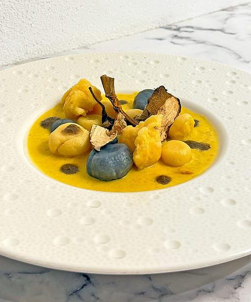 Un primo piatto goloso: vi proponiamo un tris di gnocchi con patata viola, patata gialla e zucca su una crema a base di fontina e curry ed un tocco di terra dato dai funghi porcini