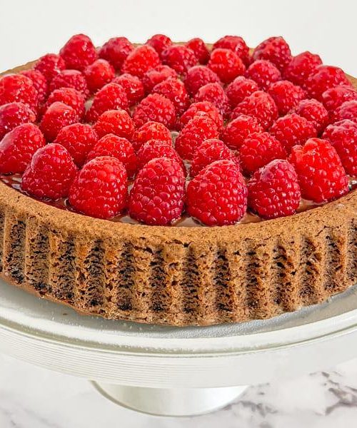 Abbiamo provato a replicare la ricetta di Lucake: una crostata morbida su stampo furbo (deve avere un avvallo interno) con marmellata di lampone, ganache al cioccolato e lamponi fr