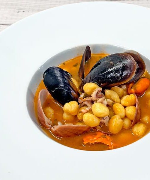 Gnocchetti mignon accompagnati da un brodetto di pesce, frutti di mare e calamaro fresco. Un'idea semplice e saporita da condividere in famiglia.