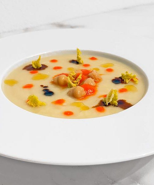 Crema di cavolfiore e porro con gocce di salsa di peperone, verza e aceto balsamico. Un primo piatto decisamente leggero e attento alla linea, ma che vi assicura un gusto top.