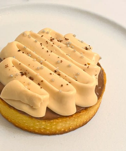 Una deliziosa tartelletta a base di pasta frolla, con doppia crema al caramello e cacao e un biscotto interno allo yogurt. Letteralmente: da leccarsi i baffi