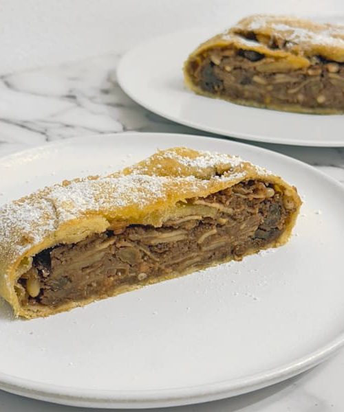 Un dolce semplice e tipico della tradizione austriaca. No frolla e no sfoglia ma fatto con la pasta strudel, sottile e perfetta per accompagnare il ripieno di mele, uvetta e pinoli