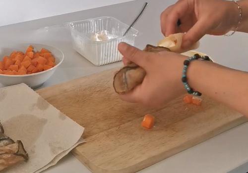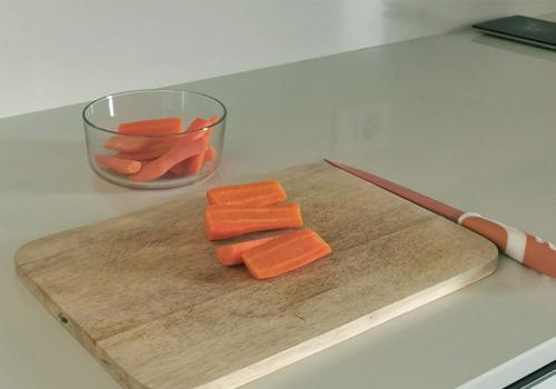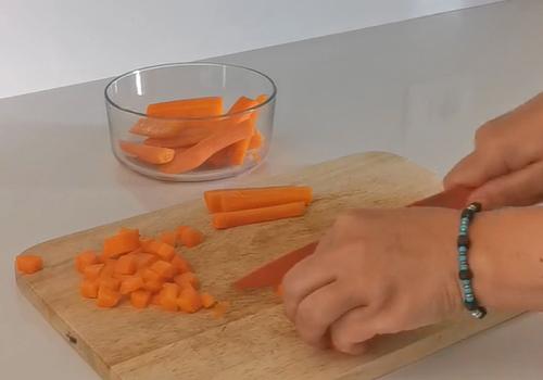 Procediamo lavando e pelando le carote, dividiamole a metà. Mettiamo sul fuoco un pentolino con acqua e sale, quando bolle versiamoci le carote e facciamole cuocere per 5 minuti. Lasciamole raffreddare nell'acqua di cottura. Una volta a temperatura ambiente le scoliamo, asciughiamo e tagliamo a dadini di piccole dimensioni.