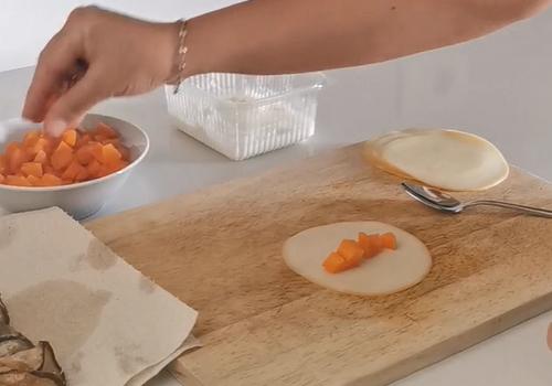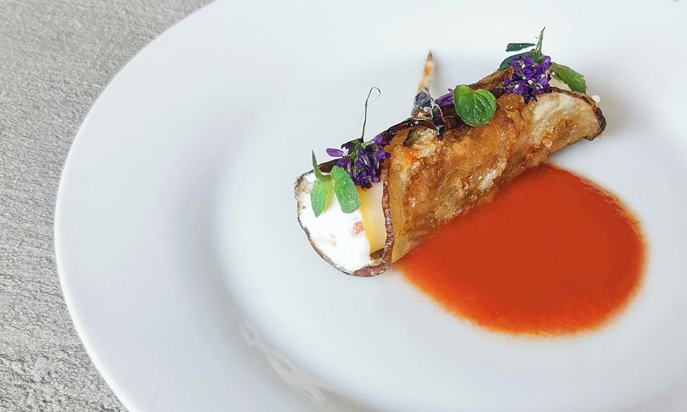 Farciamo prima i cannoli: prediamo una fetta di scamorza, mettiamo al centro dei dadini di carota e un po' di stracciatella e poi arrotoliamo delicatamente. A questo punto inseriamo questo rotolo nel cannolo di melanzana. Stessa procedura per tutti i cannoli: se la fetta di scamorza è troppo grande rispetto al cannolo, possiamo sempre utilizzare un coppa pasta per ricavarne un tondo più piccolo da farcire. Impiattiamo mettendo un cucchiaio della passata precedentemente preparata nel piatto, per farlo bene potete usare un biberon alimentare in cui metterete la passata, adagiamo accanto il cannolo di melanzana farcito e decoriamo con foglioline di menta o basilico o germogli o fiori edibili.