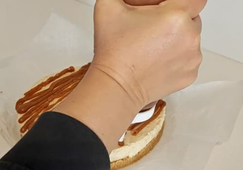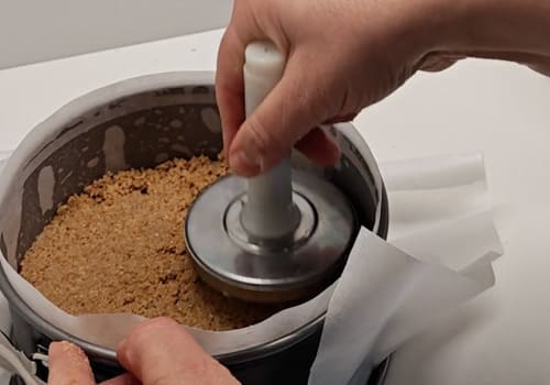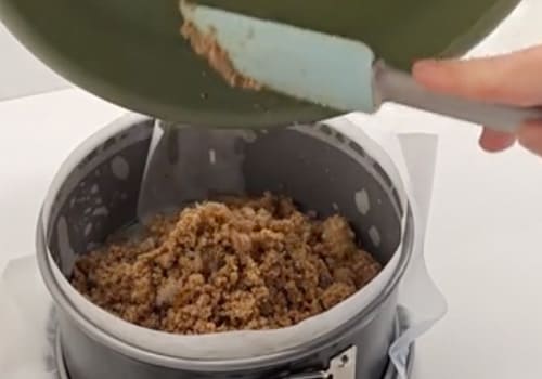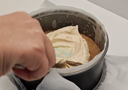 Aggiungiamo anche il burro precedentemente sciolto e frulliamo ancora fino ad ottenere un composto sabbioso. Rivestiamo la base e i bordi dello stampo con carta forno, per fare attaccare bene la carta sui bordi possiamo ungere con olio o burro. Versiamo dentro lo stampo il mix di biscotti/arachidi livelliamo aiutandoci con una spatola e un batticarne. Facciamo riposare in frigo per circa 1 ora.