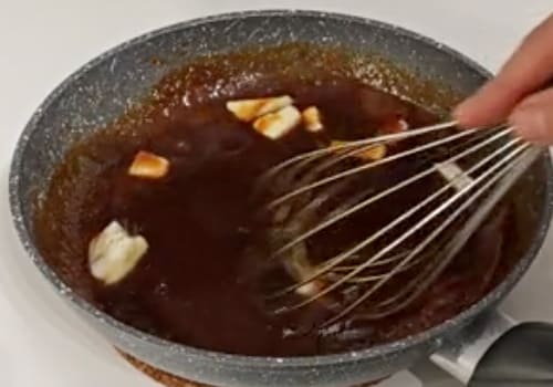 Nel frattempo in un altro pentolino scaldiamo la panna fino a portarla a quasi il bollore. Quando lo zucchero raggiunge il colore ambrato aggiungiamo la panna, ci aiutiamo con la frusta a mano. Amalgamiamo il tutto e togliamo dal fuoco. Aggiungiamo il burro ridotto a tocchetti. Mescoliamo per farlo sciogliere e infine aggiungiamo il sale. Mescoliamo bene e trasferiamo in una ciotola per farlo raffreddare.