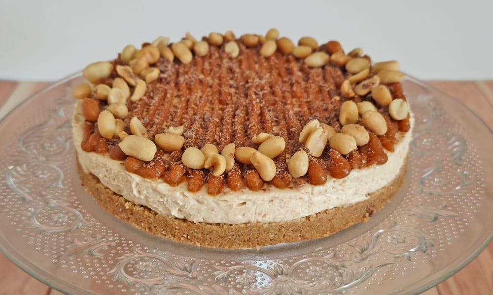 Montiamo la panna e quando inizia ad essere soda aggiungiamo formaggio spalmabile, mascarpone, zucchero a velo. Montiamo con le fruste elettriche fino ad ottenere una massa omogenea. Per ultimo aggiungiamo il burro di arachidi. Montiamo ancora qualche secondo fino a quando il tutto è ben amalgamato. Riprendiamo la nostra base e ci versiamo sopra la crema e mettiamo in frigo per almeno 1 o 2 ore.