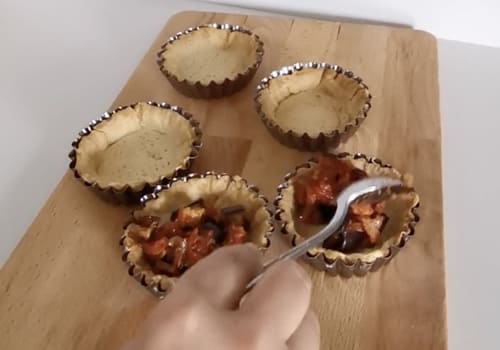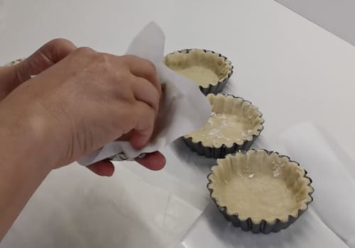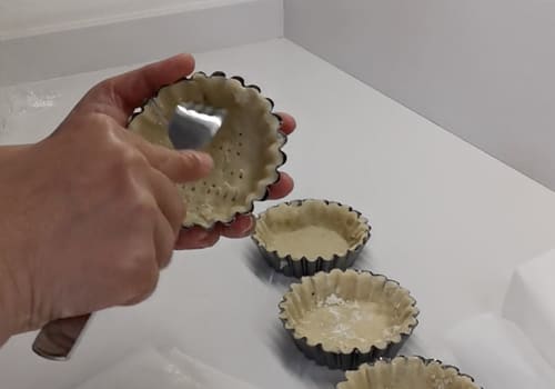 Stendiamo la pasta aiutandoci con carta forno da mettere alla base e sopra. Tiriamola con il mattarello, ricaviamo con uno stampino da 13cm dei dischi non troppo sottili. Posizioniamoli nelle formine da crostatina precedentemente spennellati con olio d'oliva o burro spry. Modelliamole sui lati con l'aiuto di un bastoncino tipo bacchette da sushi.