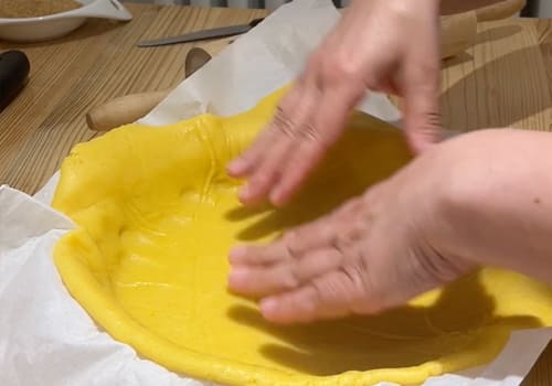 Prendiamo la frolla dal frigo, stendiamola utilizzando due fogli di carta da forno e il mattarello. Dovrà avere uno spessore massimo 4mm. Andiamo a posizionarla nella nostra teglia, facciamo aderire bene e creiamo una zigrinatura nel bordo. Bucherelliamola e procediamo con la cottura in forno statico a 180 gradi per circa 20 minuti, fino a doratura. Una volta pronta, sforniamo e lasciamo raffreddare.