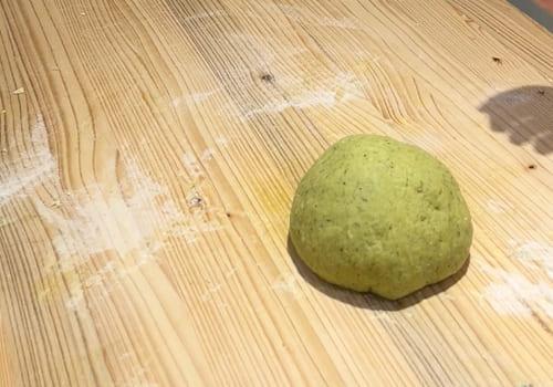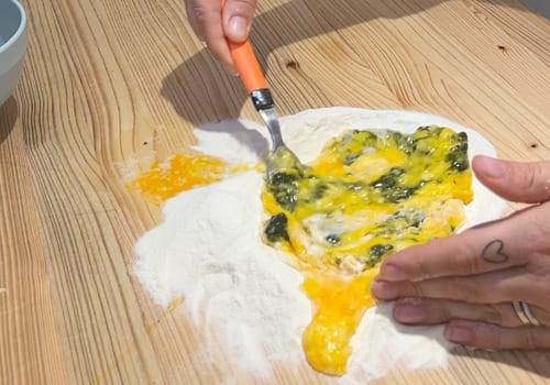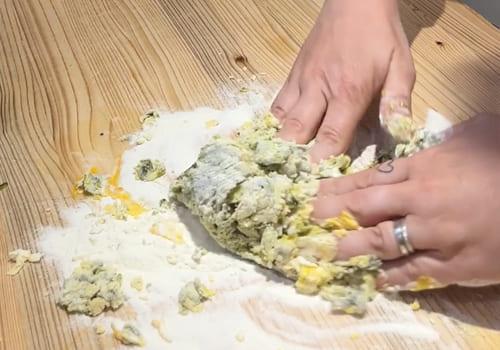 Mettiamo la farina dell'impasto verde a fontana, dentro ci mettiamo uova, sale e un cucchiaio di purea agli spinaci. Prima sbattiamole uova con una forchetta inglobando farina, poi impastiamo a mano sul piano di lavoro per 10 minuti. Al termine, avvolgiamo il panetto di pasta morbido e omogeneo con la pellicola e lasciamo riposare per 30 minuti.