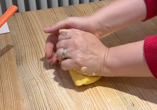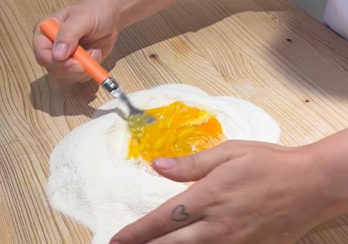 Mettiamo la farina dell'impasto giallo a fontana, dentro ci mettiamo uova e un pizzico di sale. Prima sbattiamole uova con una forchetta inglobando farina, poi impastiamo a mano sul piano di lavoro per 10 minuti. Al termine, avvolgiamo il panetto di pasta morbido e omogeneo con la pellicola e lasciamo riposare per 30 minuti.