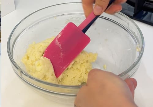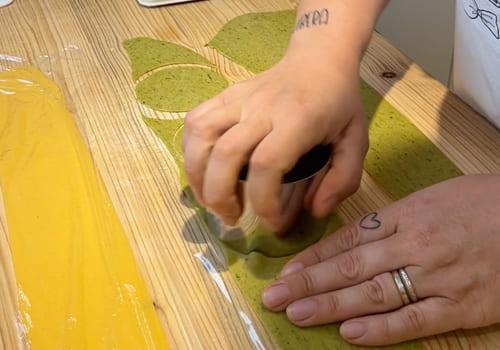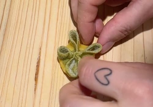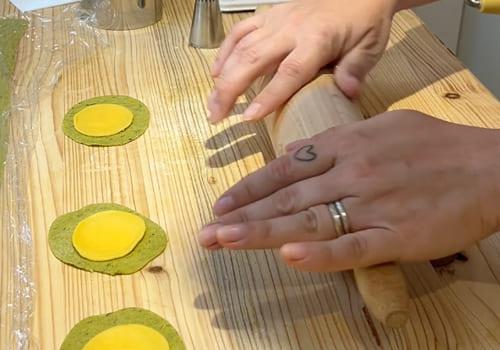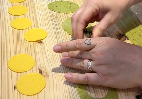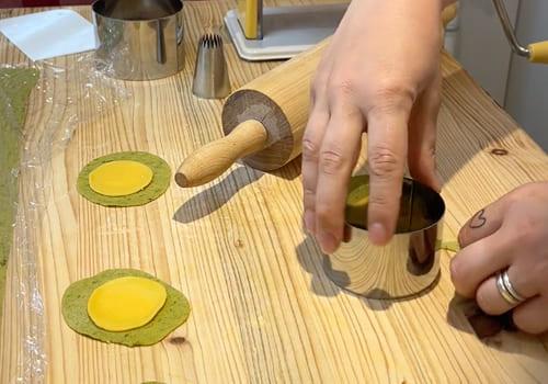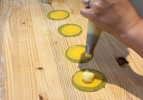 A questo punto mettiamo un dischetto giallo dove c'è il foro nel dischetto verde. Facciamo aderire bene le due paste, facendo un po' di pressione con il mattarello. Il dischetto si sarà sformato e allora andiamo a rifinirlo nuovamente con il coppapasta da 8cm. A questo punto, formati i dischetti di due colori, mettiamo al centro una noce di ripieno e procediamo con la chiusura a fiore: uniamo al centro la pasta andando a formare 5 piccole anse/aperture. Allarghiamo queste aperture con un supporto piccolo ma solido (noi abbiamo usato una bocchetta dritta della sac a poche, va bene qualsiasi cosa lunga e rigida di diametro di 2/3mm) e uniamo ogni lembo di ansa all'ansa successiva andando a creare una forma a fiore. Per questa tecnica nello specifico, vi consigliamo di andare a vedere il nostro reel sul nostro profilo instagram.