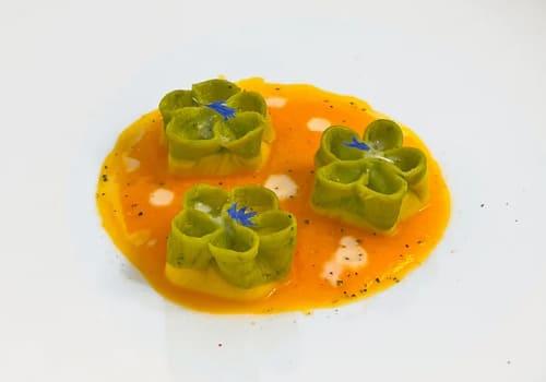 In questa ricetta vi accompagniamo nella realizzazione di una pasta ripiena speciale: i fior di ravioli gourmet. Una pasta con chiusura a fiore che serviremo con una salsa di carote e gocce di riduzione di salsa al parmigiano. E’ un piatto che ha un grado di difficoltà elevato dato anche dal doppio impasto all’uovo, ma non fatevi troppo spaventare: se ci siamo riuscite noi, ci riuscirete anche voi. Assicurato.