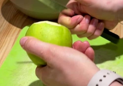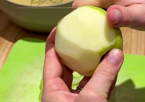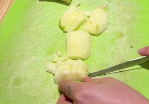 Mettiamo l’uvetta in una piccola ciotola con acqua fredda. Devono ammollarsi almeno 5 minuti. Nel frattempo prendiamo le mele, togliamo la buccia e torsolo e riduciamo la polpa in piccoli cubettini, tipo brunoise. Teniamoli da parte.