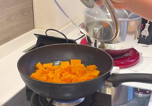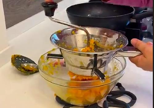 Puliamo la zucca e tagliamola a dadini. Procediamo cucinandola in un tegame con acqua fino a quando non sarà morbida/lessata. A questo punto la scoliamo e la passiamo prima con lo schiacciapatate: prima di schiacciare la zucca facciamo fuoriuscire l’acqua in eccesso e eliminiamola. Poi procediamo a schiacciare la sola polpa soda. Una volta ricavata la polpa la ripassiamo con il passa verdura per ottenere una consistenza meno granulosa.