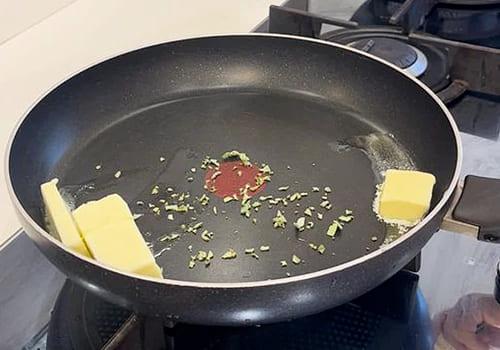 Tritiamo a coltello la salvia, posizioniamola in una padella con il burro: accendiamo il fuoco a bassa intensità e facciamo sciogliere il burro e amalgamare i due ingredienti. Spegniamo e lasciamo da parte.