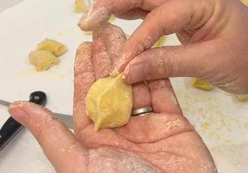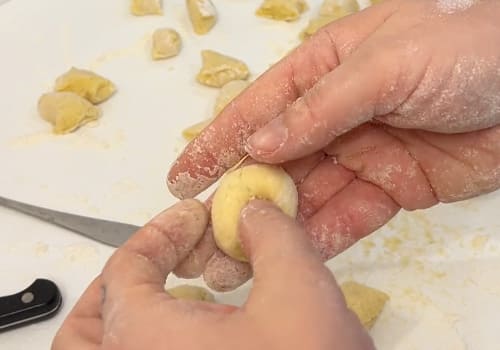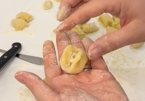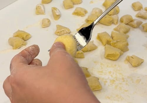 Prendiamo un pezzo di panetto di patata, arrotoliamolo a filoncino di 1/1,5 cm, porzioniamo gli gnocchi. Prendiamo ogni pezzettino, lo arrotoliamo, creiamo un incavo in mezzo, posizioniamo dentro un pezzetto di gorgonzola e andiamo a sigillare le estremità lasciando il ripieno all'interno. Arrotoliamo a pallina e diamo poi la rigatura con la forchetta. Procediamo così per tutti il panetto.