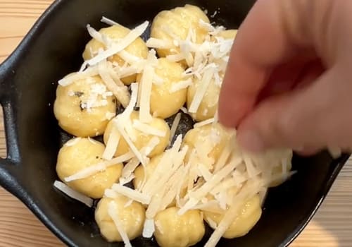 In una padella andiamo a sciogliere il burro con la salvia spezzettata. Facciamo bollire una pentola piena d'acqua e al bollore immergiamo gli gnocchi. Sono pronti quando vengono a galla. Scoliamoli nel condimento burro e salvia, facciamoli rapprendere nel burro e salvia. A questo punto impiattiamoli in una cocotte. Mettiamo sopra ogni cocotte 30gr di parmigiano reggiano grattugiato a scagliette e inforniamo nel forno preriscaldato in modalità grill fino a che non diventano dorati (8minuti). Serviamo le cocotte ancora calde.