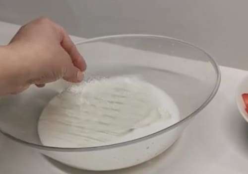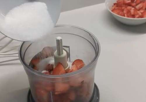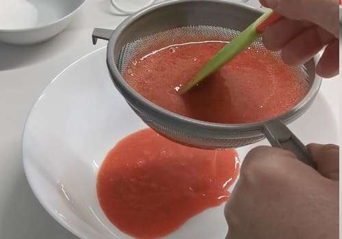 Mettiamo le fragole in un mixer con 40gr di zucchero e un cucchiaio di succo di limone e frulliamo. Filtriamo la purea così ottenuta con un setaccio. Montiamo la panna con 10gr di zucchero.