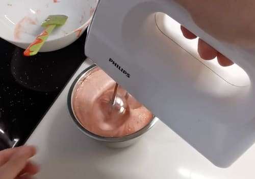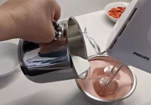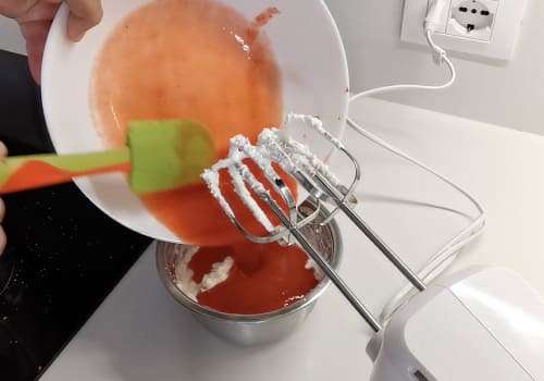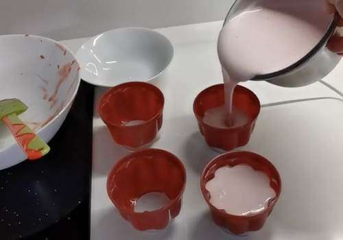 Quando la panna è ben ferma, aggiungiamo anche la purea di fragole continuando a montare. Aggiungiamo, a filo, il latte agli altri ingredienti sempre continuando a montare. Versiamo il composto negli stampini e facciamo solidificare in frigorifero per circa 6 ore prima del consumo.