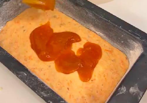 A questo punto prendiamo lo stampo lo imburriamo e infariniamo. Versiamo dentro 1/3 del composto preparato, poi posizioniamoci sopra con un cucchiaio la marmellata e completiamo versandoci sopra la restante parte del composto. Cuociamo a 170° forno statico per 1h e 10 minuti: in cottura lieviterà e si aprirà in superficie.