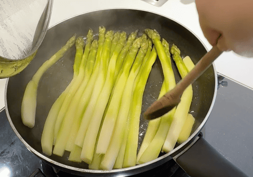 Prendiamo gli asparagi, sciacquamoli e peliamoli. mettiamoli in una pentola capiente interi, un pizzico di sale, un filo d’olio e mezzo bicchiere d’acqua. Cuociamoli con il coperchio a fiamma media per 15 minuti. Una volta pronti tagliamoli a tocchetti e acqua di cottura, preservando le punte che teniamo da parte per decoro.