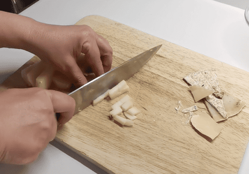 Scoliamo i nostri carciofi, li mettiamo nel bicchiere del mixer e li frulliamo fino ad ottenere una crema, aiutandoci con un po' di brodo. Una volta frullato il tutto, passiamo la purea ottenuta al setaccio. Otterremo una crema che teniamo da parte. Gli scarti li aggiungiamo al brodo di verdure che andremo a scaldare, facciamo bollire per 5 minuti poi setacciamo. Tagliamo a piccoli quadratini l'estremo e teniamo da parte.