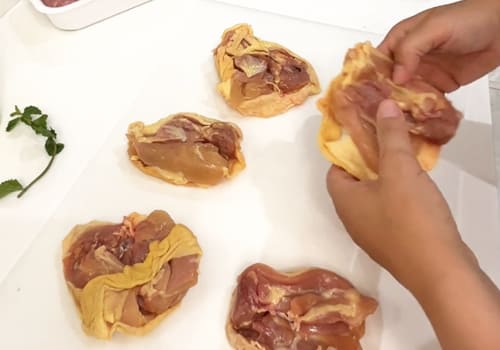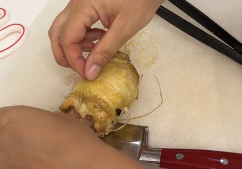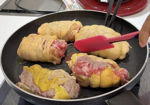 Prendiamo le sovracosce di pollo (mi raccomando già disossate): stendiamole con la pelle rivolta verso il basso. Saliamole, mettiamo su ogni pezzo una salsiccia tolta dal budello e schiacciata con le mani (appiattita). Procediamo arrotolando il tutto ben stretto in modo tale da formare un filoncino e chiudiamo il tutto con lo spago da cucina.