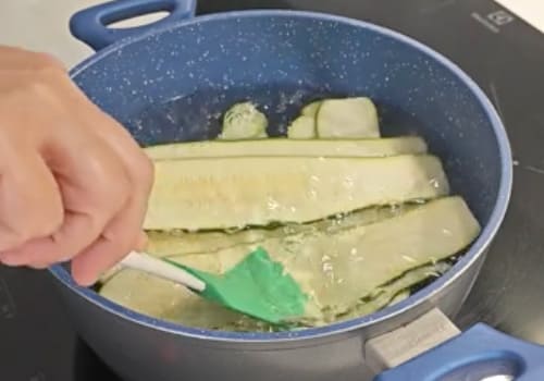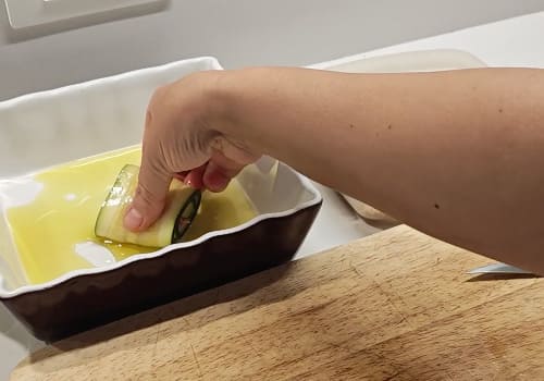 Laviamo le zucchine, togliamo le estremità e, con la mandolina, ricaviamo delle fette di 4 mm di spessore. Mettiamo a bollire una pentola d’acqua salandola, al bollore sbollentiamo le zucchine per 5 minuti. Scoliamo le fette di zucchine e mettiamo sopra ogni fetta una strisciolina di prosciutto cotto e di provola piccante della stessa dimensione della fetta di zucchina, arrotoliamo la fetta di zucchina.
