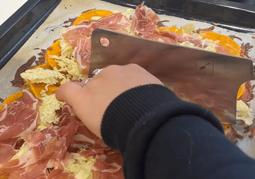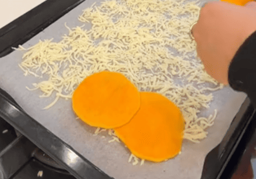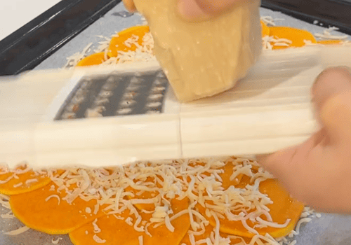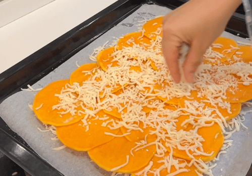 Laviamo e togliamo la buccia alla zucca. Ricaviamo dalla parte allungata 16 fette tonde sottili, spesse un paio di mm. Grattuggiamo il parmigiano. Posizioniamo su una leccarda rivestita con carta da forno metà della nostra mozzarella alla julienne come base. Sopra ci mettiamo le nostre fette di zucca sovrapponendole parzialmente in modo da creare uno strato compatto e uniforme. E sopra ancora la restante mozzarella, il parmigiano, il pecorino, olio e sale.