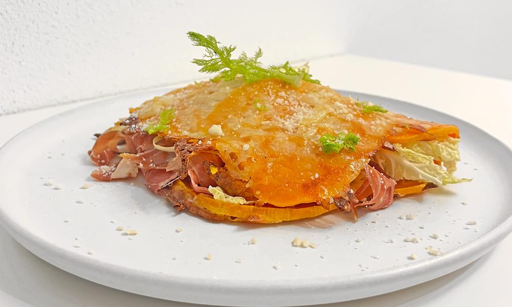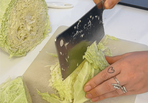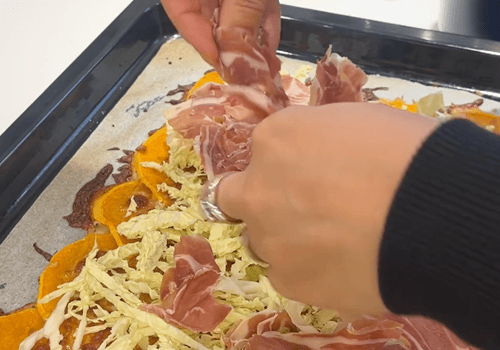 Preriscaldiamo il forno a 190 gradi. Cuociamo per 10 minuti. Posizioniamo il forno sulla modalità grill a 275 gradi e grigliamo per 5 minuti. Una volta sfornata, tagliamo la verza a fettine e farciamo il nostro sandwich sia con verza che con il prosciutto crudo. Tagliamo a metà e richiudiamo ogni parte su se stessa facendo attenzione che non si rompa, andando a dare la forma di sandwich. Mangiatelo ancora caldo, delizioso.