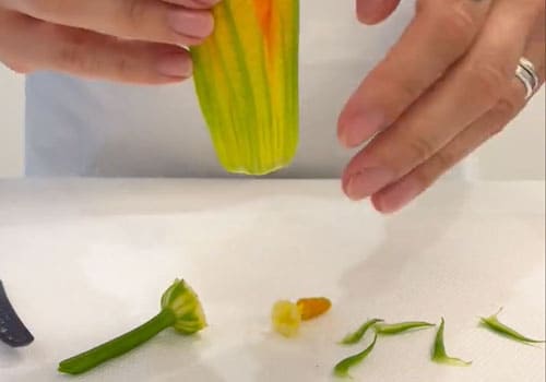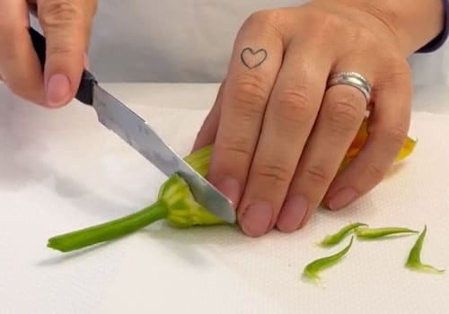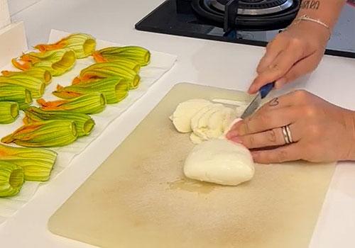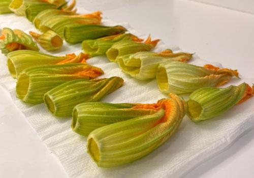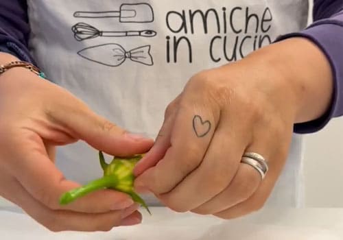 Iniziamo con la pulitura: prendiamo ogni fiore di zucca e togliamo alla base gli spinotti verdi, sono delle piccole foglioline sottili. Togliamoli con le mani dolcemente: non dobbiamo creare buchi. A questo punto con un coltello tagliamo la parte inferiore del fiore: il taglio fa fatto per togliere il gambo e staccare internamente il pistillo: tagliamo quindi alla fine del fiore ovvero all'inizio della protuberanza rotondeggiante del gambo. Se il taglio è fatto al punto giusto vedrete che il pistillo uscirà da solo dalla parte del taglio. Eseguite quest'operazione per tutti i fiori e poi sciacquateli sotto il getto corrente di acqua fredda: attenzione che il getto non deve essere forte per evitare di romperli. A questo punto fateli scolare/asciugare in un panno di carta assorbente fino all'utilizzo.