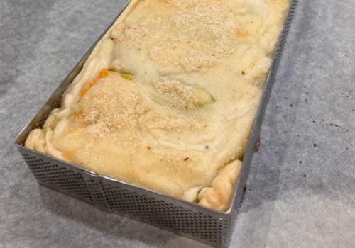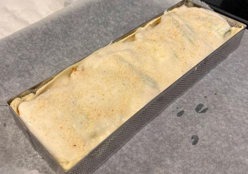 Prepariamo in un pentolino la besciamella (la ricetta la trovate sempre in questo nostro blog andate su stuzzichini > besciamella), tagliuzziamo grossolanamente i pomodori secchi e tagliamo a fette abbastanza sottili la mozzarella. A questo punto prepariamo la pasta sfoglia: foderiamo una placca da forno, posizioniamo lo stampo e adagiamo sopra la pasta sfoglia. Bucherelliamola con la forchetta.