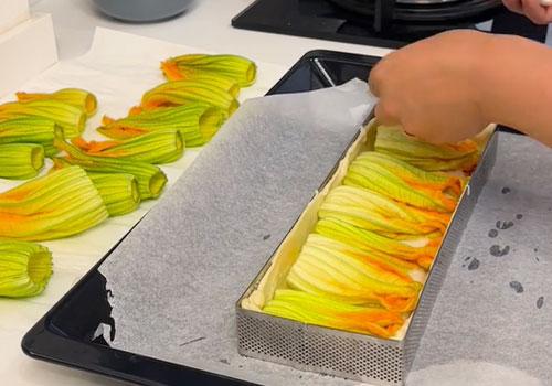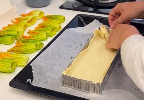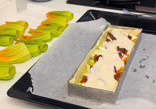 In questa ricetta Elisa vi accompagna nella preparazione di uno sformato che ha come base la pasta sfoglia, ma si può utilizzare anche la pasta brisè, e due ingredienti principe fiori di zucca e pomodorini secchi. Per la realizzazione vi servirà però uno stampo rettangolare 29cm x10 cm alto almeno 3 cm. La ricetta della nostra besciamella la trovate qui.