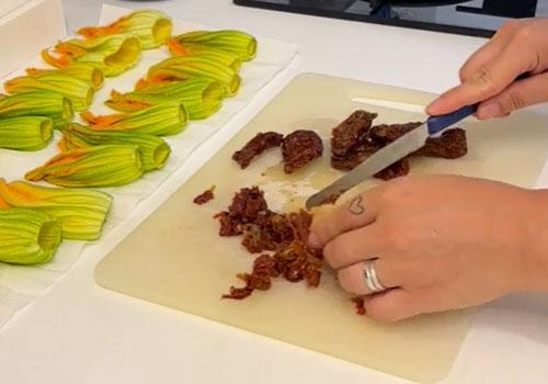 Adagiamo sul fondo dello sformato un po' di besciamella posizioniamo sopra uno strato di fiori di zucca, metà dei pomodori secchi e tutta la mozzarella. Versiamo ora metà della besciamella rimasta e continuiamo con un nuovo e ultimo strato di fiori di zucca, pomodori secchi e besciamella. Infine spolveriamo lo sformato con pane grattato. A questo punto inforniamo a 190° per 50/55minuti a forno statico e il vostro sformato è pronto per essere porzionato e servito.