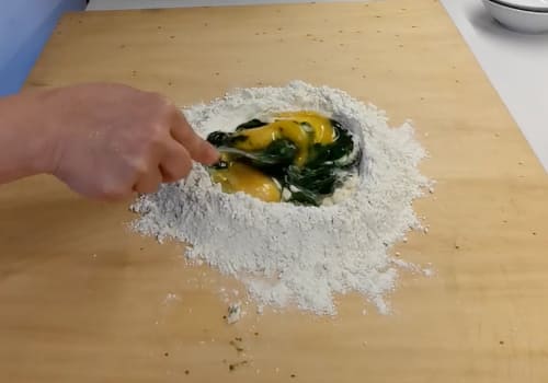 Prepariamo la purea di spinaci che ci servirà per i tagliolini verdi. Laviamo gli spinaci e mettiamoli in padella con un filo d'olio e facciamo appassire per circa 10 minuti. Poi lasciamo intiepidire e frulliamo il tutto in mixer. Formiamo una fontana con la farina e semola e mettiamo al centro 40gr di purea di spinaci, il sale, 2 uova e iniziamo ad impastare prima sbattendo con la forchetta e successivamente a mano. Impastiamo per 10 minuti poi avvolgiamo in pellicola e facciamo riposare 30 min.