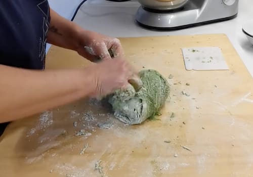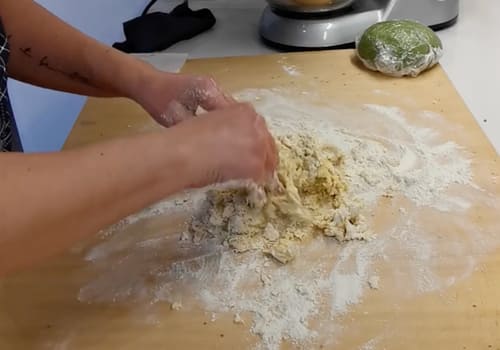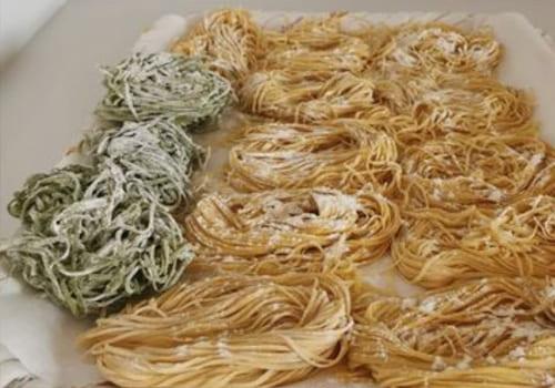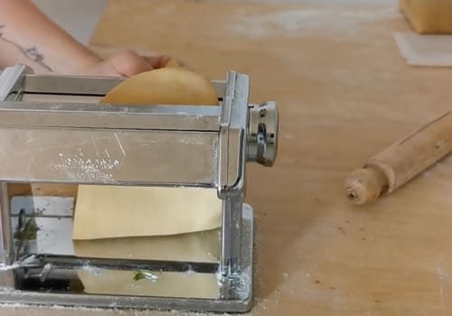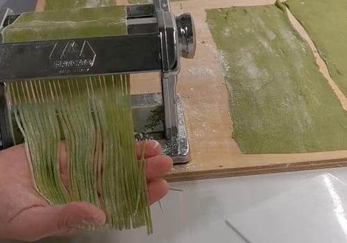 Trascorsi i 30 minuti tiriamo le sfoglie fino alla terzultima misura della macchina per pasta (nel nostro caso da 1 a 9, la misura 7). Quando tutta la sfoglia è pronta la tagliamo a pezzi da circa 40 cm e procediamo a fare i tagliolini utilizzando il rullo della macchina per pasta. Fatti i tagliolini avvolgiamoli creando dei nidi non troppo grandi e ben infarinati e metterli in un vassoio per farli essiccare, altro metodo è mettere un manico di scopa igienizzato tra due sedie e stendere i tagliolini, si essiccheranno più velocemente.