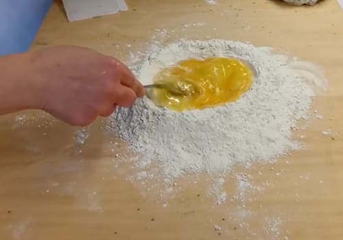 Prepariamo la pasta gialla mettendo sulla spianatoia farina e semola, formiamo una fontana e mettiamo all'interno le 2 uova e il sale ed iniziamo ad impastare, prima sbattendo le uova e inglobando farina e semola e poi a mano. Impastiamo 10 minuti e mettiamo in pellicola sempre per 30 minuti.