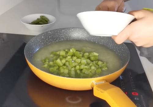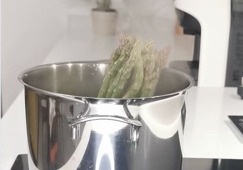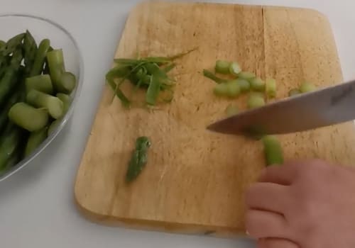 Sbollentiamo gli asparagi in acqua per 8 minuti cercando di tenere le punte fuori dall'acqua, poi li scoliamo e successivamente li mettiamo in acqua e ghiaccio per bloccare la cottura e mantenere un bel verde. Quando saranno tiepidi li spelliamo e stacchiamo le punte che condiremo con un filo di olio extravergine d'oliva e che metteremo da parte per decorare il piatto. Il resto dell'asparago lo facciamo a pezzetti.