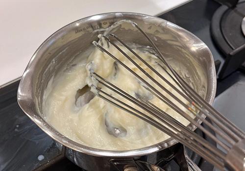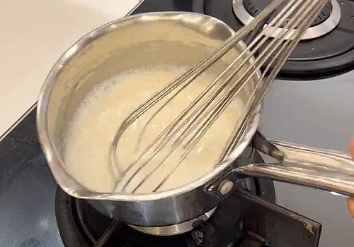 Mettiamo in un pentolino i due ingredienti per preparare il Tang Zhong, ovvero una sorta di pre impasto: prima versiamo i 125gr di latte e poi i 30gr di farina 00. Mescoliamo a fuoco spento con energia usando la frusta in modo che la farina di amalgami al latte senza fare grumi. Una volta inglobata accendiamo il fuoco a media fiamma e continuiamo a mescolare fino a che non assume una consistenza simile alla besciamella, soda.