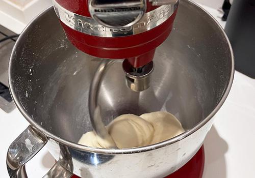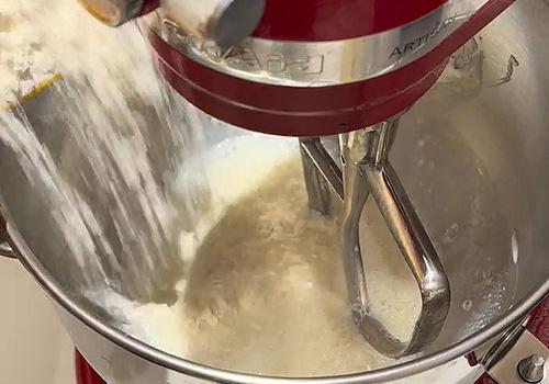 Aggiungiamo nella planetaria il latte e azioniamo il gancio a foglia. Il latte inizierà a raffreddare il tang zhong. A questo punto aggiungiamo farina, zucchero, lievito e facciamo andare per un paio di minuti. Poi cambiamo gancio e utilizziamo quello per impastare: facciamo andare per altri 8 minuti a velocità medio/alta. Aggiungiamo il sale e facciamo andare per altri 8/10 minuti la planetaria.