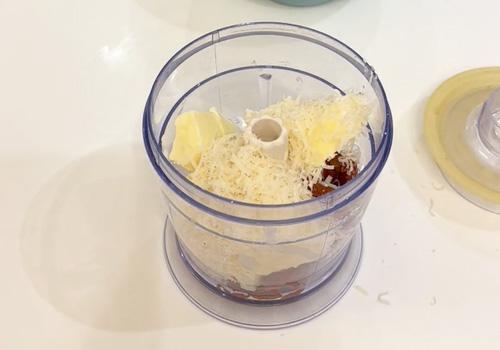 Grattugiamo il parmigiano reggiano e inseriamolo in un mixer tritatutto insieme ai pomodorini secchi sgocciolati e il burro. Tritiamo bene il tutto e versiamolo in una ciotola. A questo punto aggiungiamo alla crema creata la philadelphia alle erbe e amalgamiamo bene il tutto. La crema è pronta.
