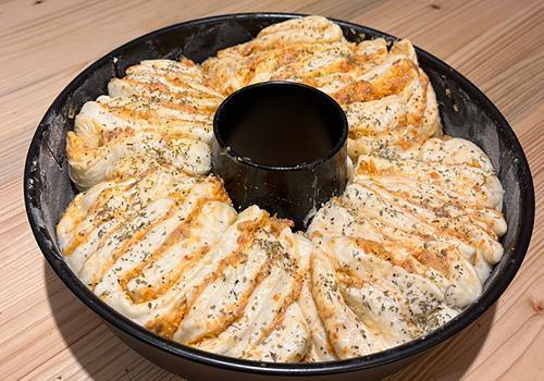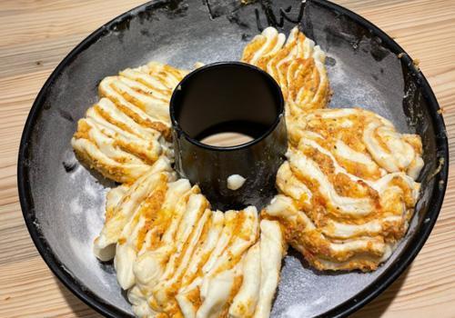 Prendiamo l'impasto raddoppiato e tagliamolo in 4 parti. Ogni parte stendiamola con il mattarello formando una striscia di circa 40cm per 12/15cm di diametro. Spalmiamo sopra la crema e tagliamo la striscia nel lato più corto in 5 parti e nel lato più lungo in 2 parti. A questo punto prendiamo ogni parte e sovrapponiamole le une alle altre formando una piccola torre / un piccolo mucchietto. Lo compattiamo con le mani e lo inseriamo nello stampo a ciambella precedentemente imburrato e infarinato. Inseriamo i 4 mucchietti ogni 45 gradi dello stampo come nelle foto.