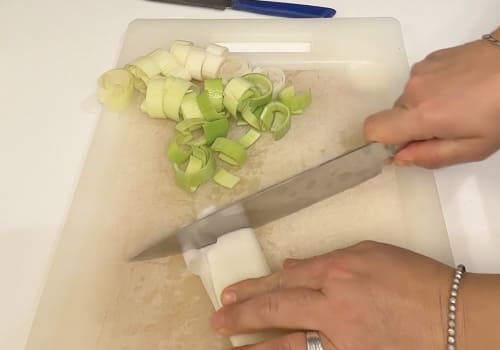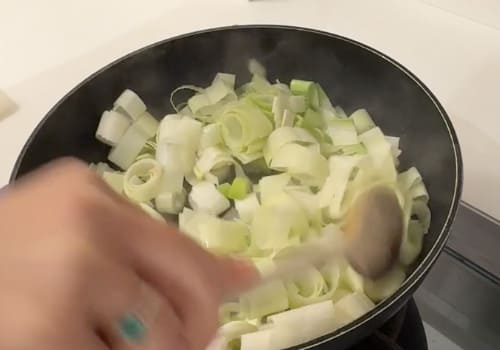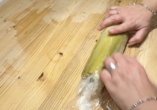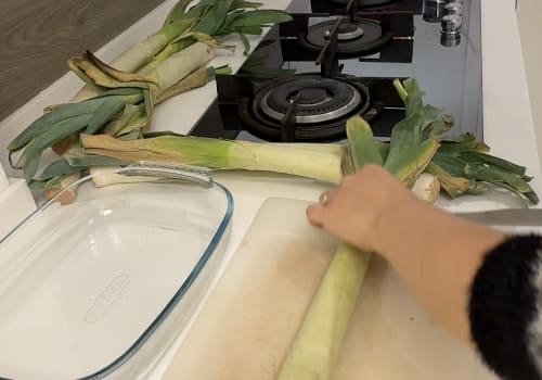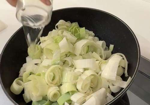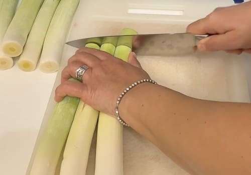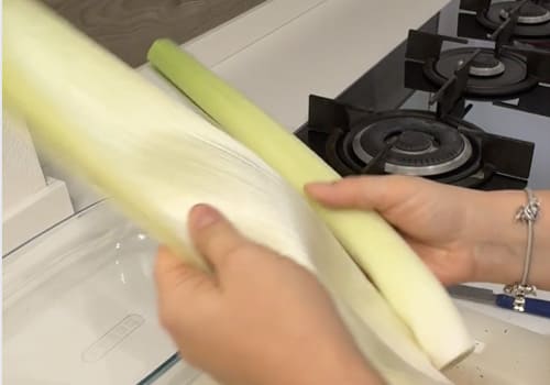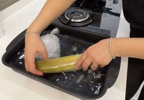 A fine cottura stendiamo su un piano un foglio di pellicola. Scoliamo e strizziamo i nostri porri dal brodo e li posizioniamo nella pellicola. Arrotoliamoli e avvolgiamoli formando un salsicciotto e evitando che si creino spazi tra i porri. Risigilliamo con un altro foglio di pellicola e immergiamo il tutto in un contenitore con acqua fredda e ghiaccio. Teniamolo li girandolo di tanto in tanto per 30 minuti.