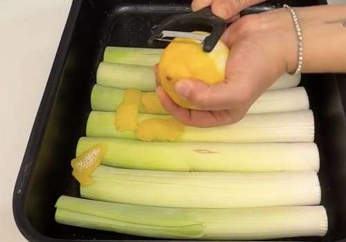 Prendiamo i cuori di porro, li mettiamo in una teglia che prima abbiamo irrorato di olio. Aggiungiamo sopra un filo d’olio, la buccia di un limone, il brodo, saliamo. Procediamo a metterli in forno statico preriscaldato a 200 gradi coperti da carta di alluminio per 30/40minuti, fino a che non saranno morbidi. Una volta cotti li togliamo dalla teglia, recuperiamo il brodo che lo posizioniamo in una padella. Lo scaldiamo e dentro ci facciamo sciogliere lo zucchero. Mettiamo nella padella i nostri porri e li facciamo cuocere altri 10 minuti girandoli di tanto in tanto nella padella con coperchio.