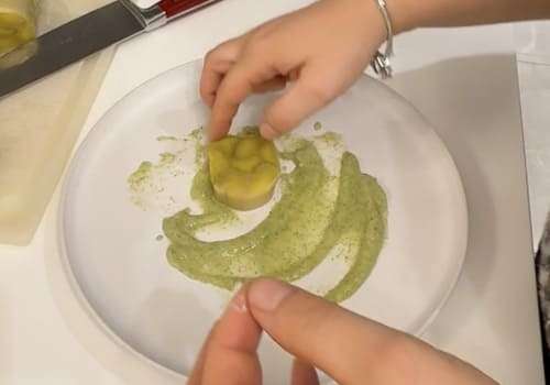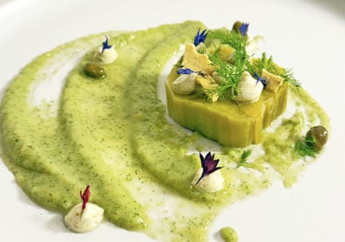 Prendiamo la terrina e tagliamo le nostre 8/10 fette spesse 1 cm circa. Nel piatto mettiamo come base la crema di porro e sopra 1 fetta di terrina di porro, togliamo la pellicola attorno. Decoriamo sopra con ciuffi di maionese, ciuffi di barba di finocchio e qualche pezzetto di cracker alle olive sbriciolato. Terminiamo con qualche capperino nel piatto e qualche fiore edibile.